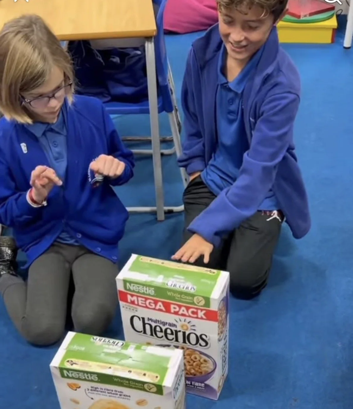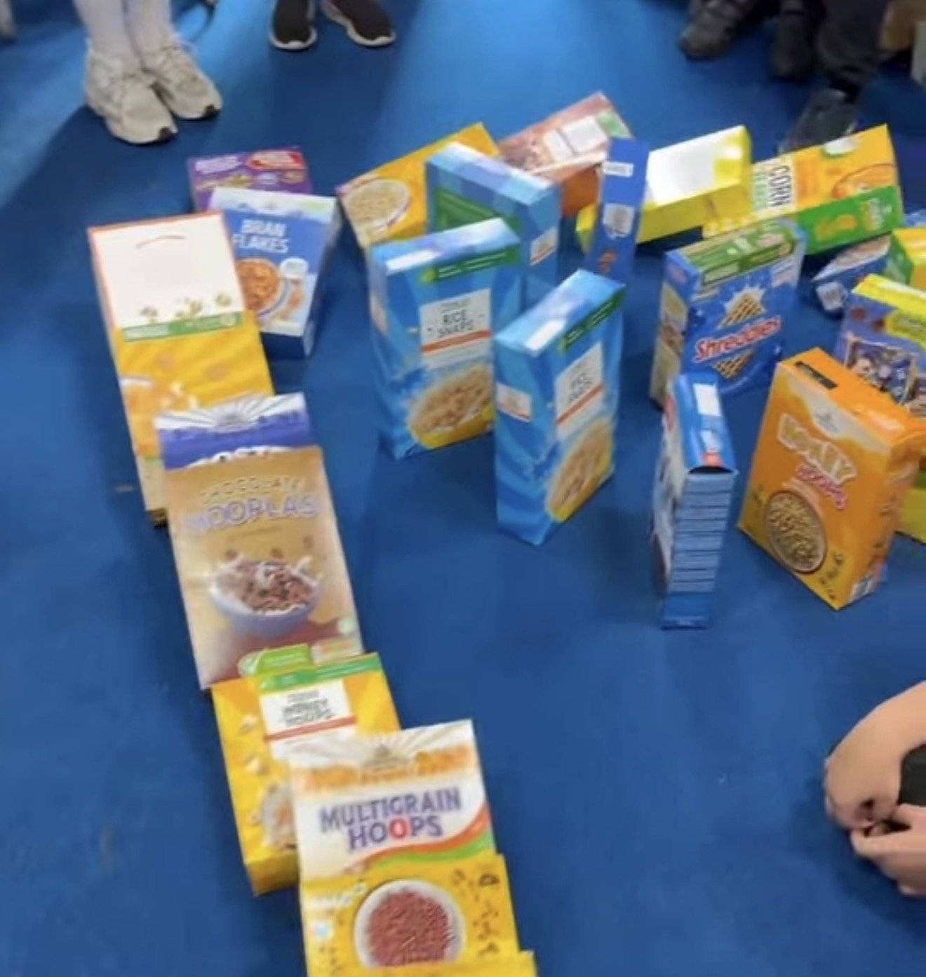 Next, they took on the cereal box domino challenge, carefully building an incredible course that twisted and turned through the school. Every tumble of a box brought cheers and excitement, and the energy was contagious. But this was more than just a fun activity — each box represented an act of kindness.